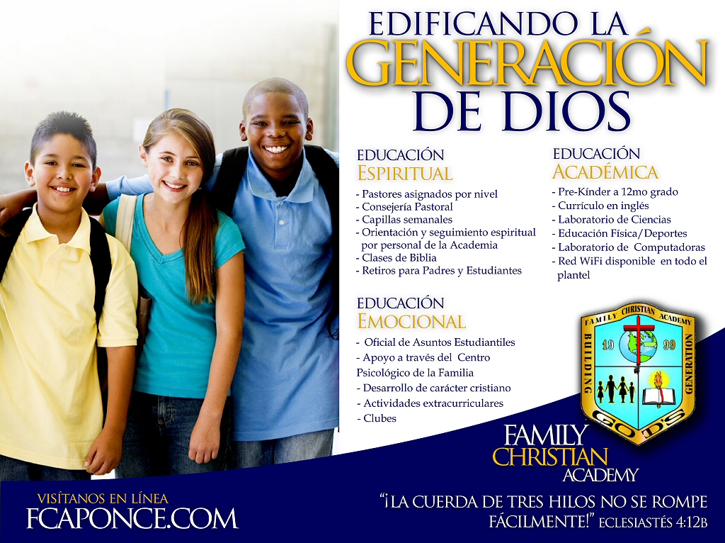 Bajo la visión que ha dado Dios a la Iglesia Cristiana de la Familia surge la Family Christian Academy (FCA). Consciente de una educación de excelencia y de la necesidad de formar de carácter firme y recto dentro de los principios y valores cristianos en cada niño y joven surge en 1999 la FCA. Con el compromiso de satisfacer las necesidades intelectuales, emocionales y espirituales de nuestros estudiantes, hemos implantado el currículo de enfoque educativo tradicional-dirigido de “A Beka Book”. Todos los libros de textos son escritos y basados en las investigaciones que realizan los escritores, en la Palabra de Dios y en el contenido educativo de los textos. Este currículo incluye las clases de Biblia, Matemáticas, Ciencia, Estudios Sociales e Inglés presentadas desde perspectiva bíblica, enfatizando el desarrollo del carácter y proveyendo las herramientas necesarias para una vida fructífera. En adición a las materias antes mencionadas, FCA ofrece otras clases utilizando libros de texto que no están incluidos en el currículo A Beka Book como: Español, Historia de Puerto Rico, Educación Física, Bellas Artes, Computadora, entre otras. FCA provee enseñanza a sus estudiantes utilizando ambos idiomas: español e inglés.